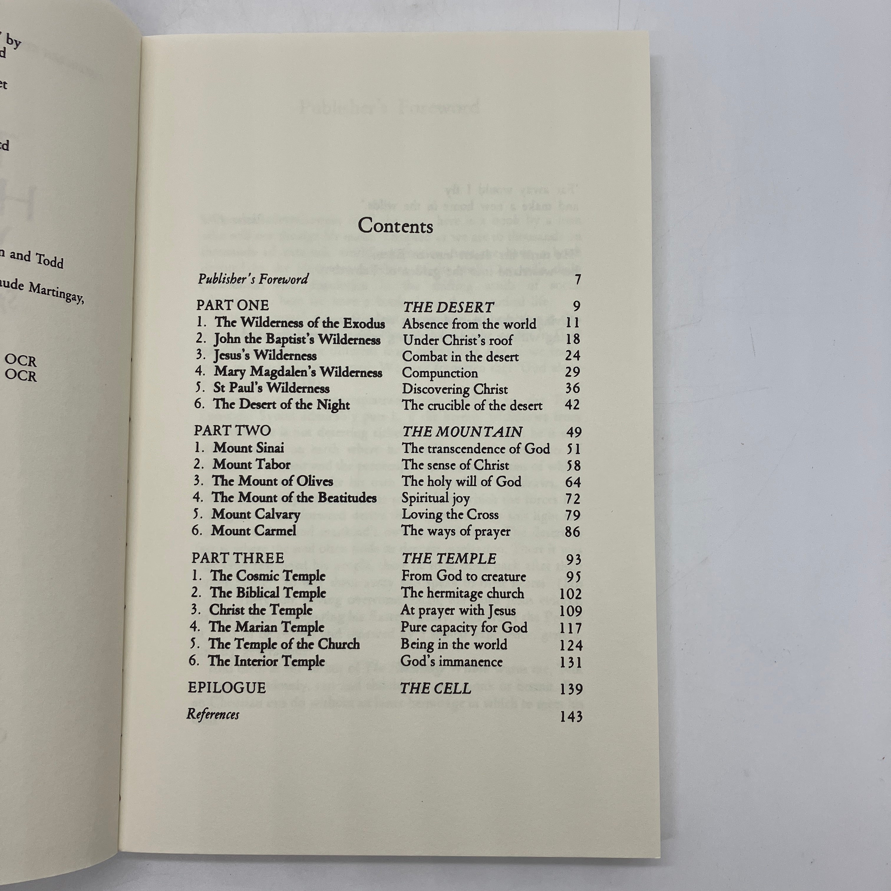 The desert, the mountain, and the temple provide the focus of the anonymous author's reflections. He meditates on the wilderness experiences of such biblical persons as Jesus, John the Baptist, and Mary Magdalen. He considers the place held in the Christian story by Mount Sinai, the Mount of Olives, and Calvary. He ponders the idea of temples, using such images as our inner temple and Christ the temple, the foundation of the Church.