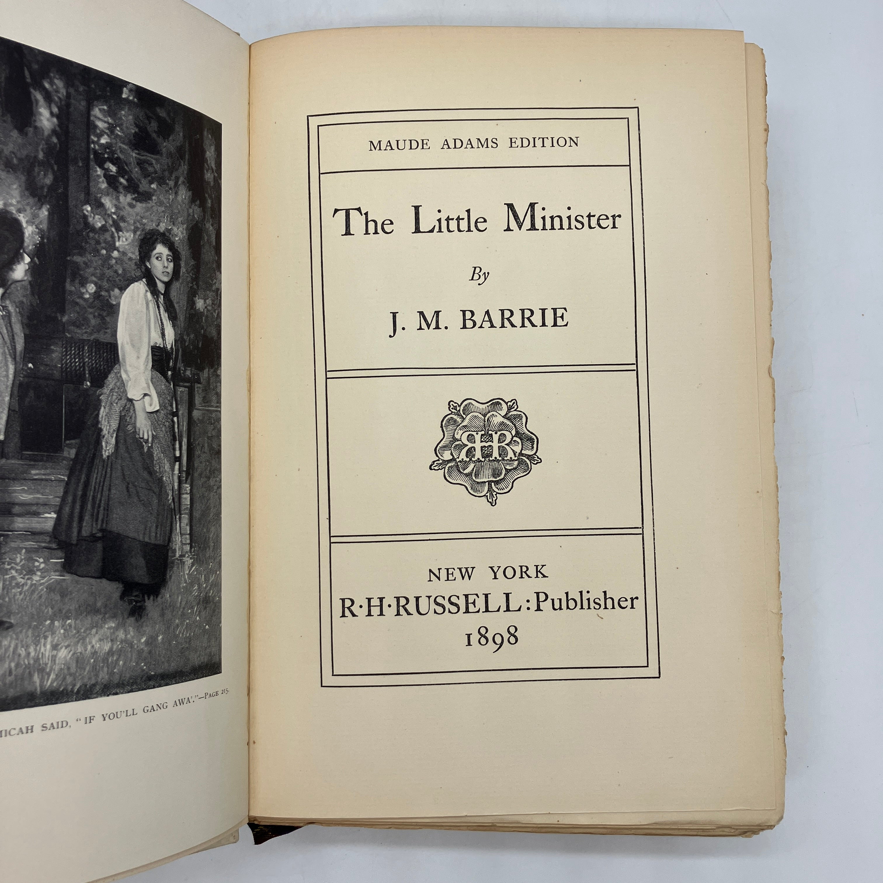 R.H. Russell Publisher, 1898. First edition antiquarian cloth bound hardcover of The Little Minister: Maude Adams Edition by J.M. Barrie.