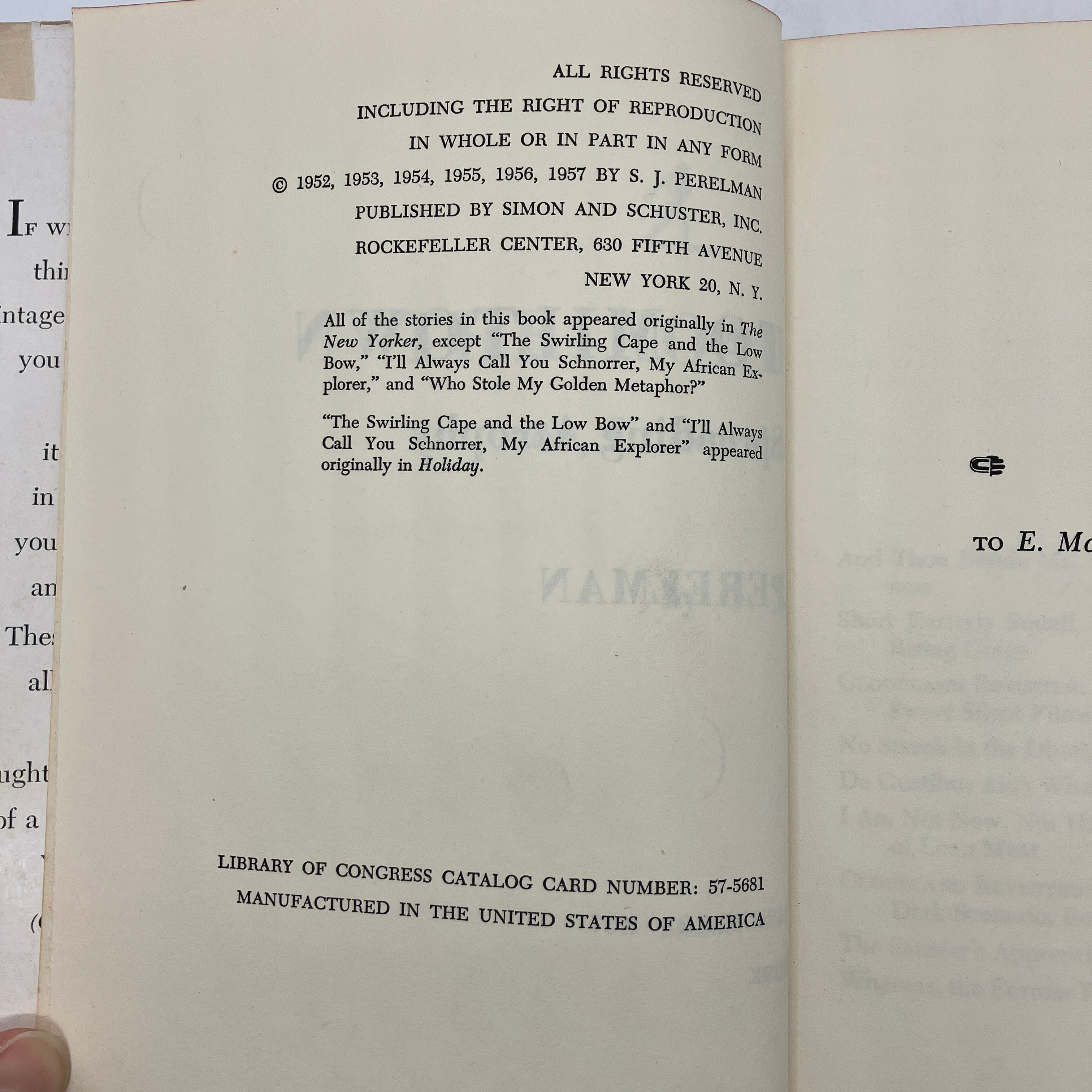 S. J. Perelman, was an American humorist, author, and screenwriter. He is best known for his humorous short pieces in The New Yorker 34 of which appear in this volume.
